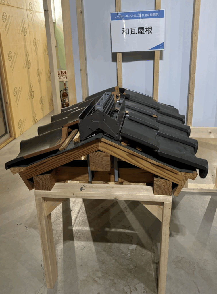 屋根の上に取り付けるハットヘルス見本(他の形状の屋根も展示されています)